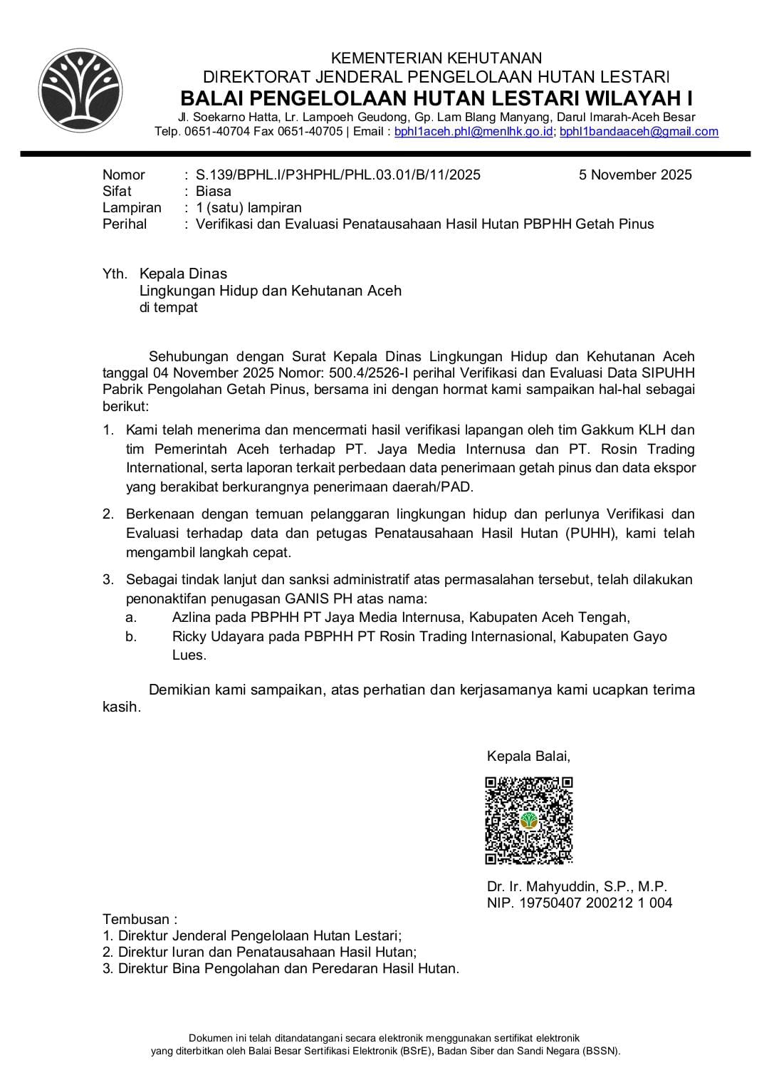 Aceh, 5 November 2025 — Pemerhati Lingkungan Budaya dan Sosial (PERLIBAS) Gayo menyampaikan apresiasi atas langkah tegas Balai Pengelolaan Hutan Lestari (BPHL) Wilayah I dalam menindak persoalan ketidakwajaran data dan dugaan pelanggaran penatausahaan getah pinus yang dilakukan oleh PT Jaya Media Internusa (JMI) dan PT Rosin Trading Internasional (PT Rosin).
